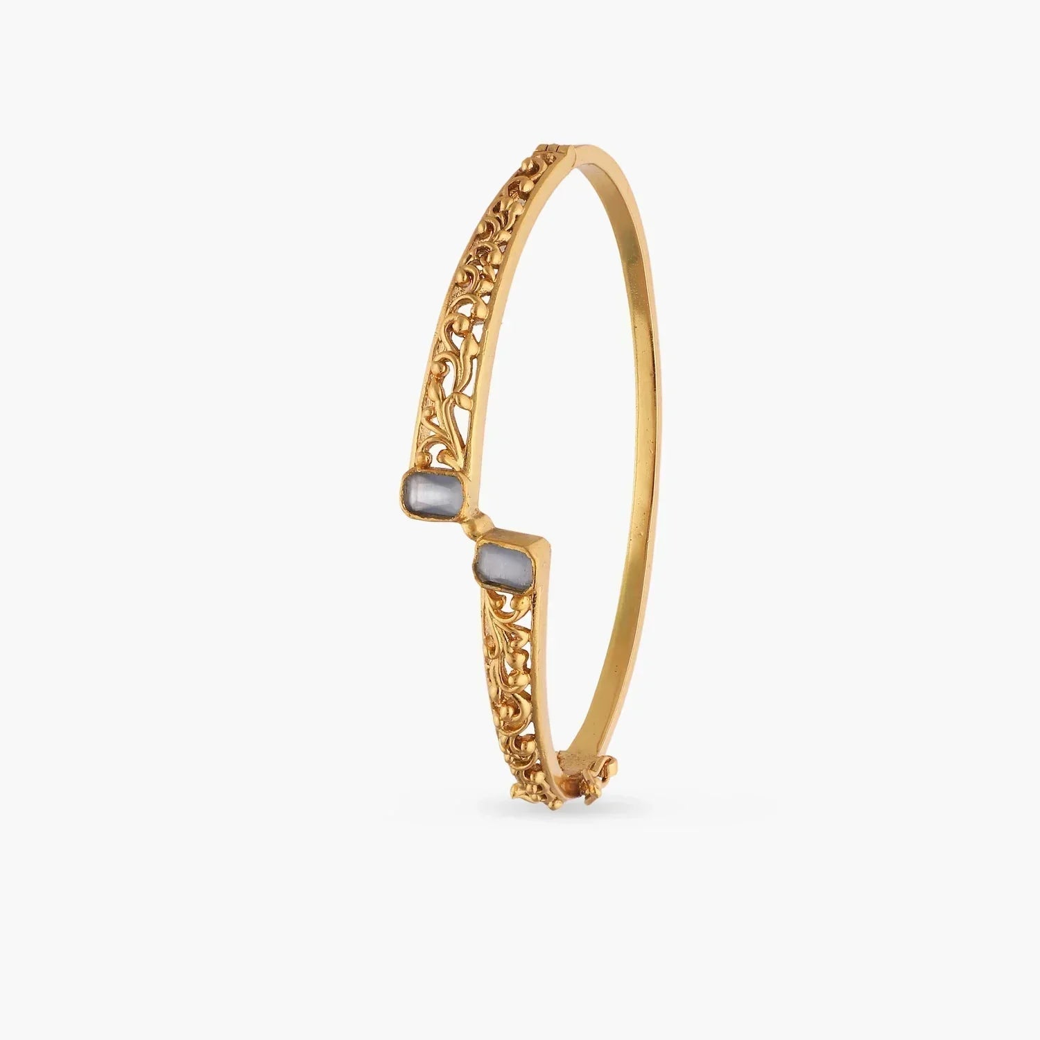 Inspired by the rich tribal culture, this bracelet is eclectic and has an earthy feel to it. It is gold plated with oxidized finish to give the definite earthy charm.
