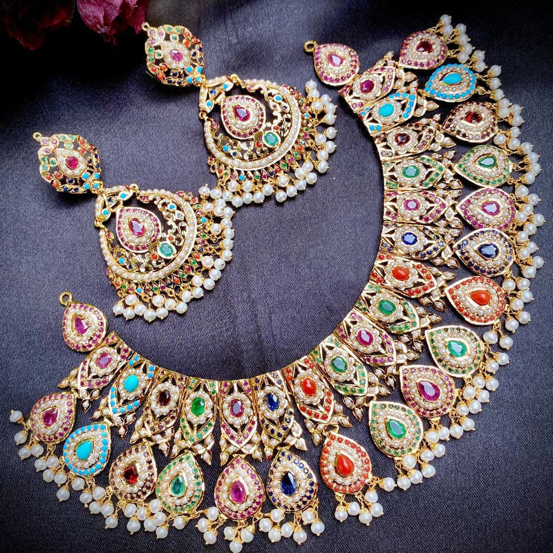 Featured is a broad navratna necklace with matched pair of chandbali earrings. The stones in setting are precious freshwater pearls, rubies, emeralds, blue sapphires, corals, turquoises and garnet.