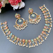 Featuring a evergreen and delicate navratan necklace with chandbali earrings. The necklace set has been embellished with rubies, emeralds, turquoises, corals, garnet, blue sapphires and pearls.