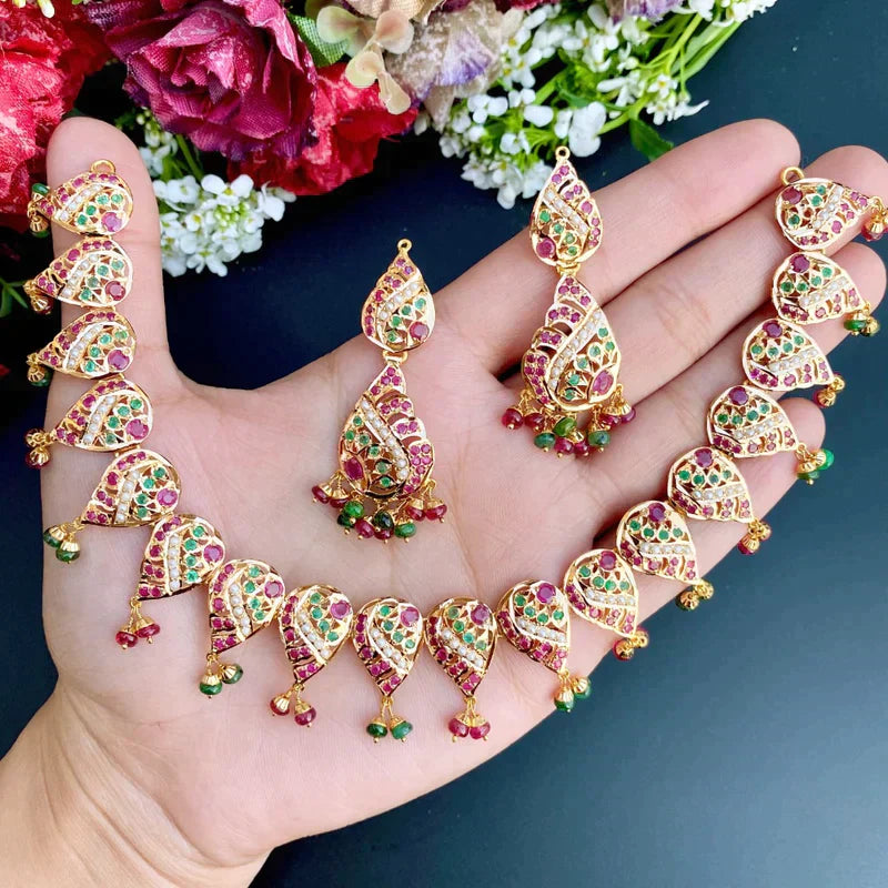 Featured is a multicolored jadau necklace matched with a pair of earrings. The set is embellished with precious rubies, emeralds and pearls.