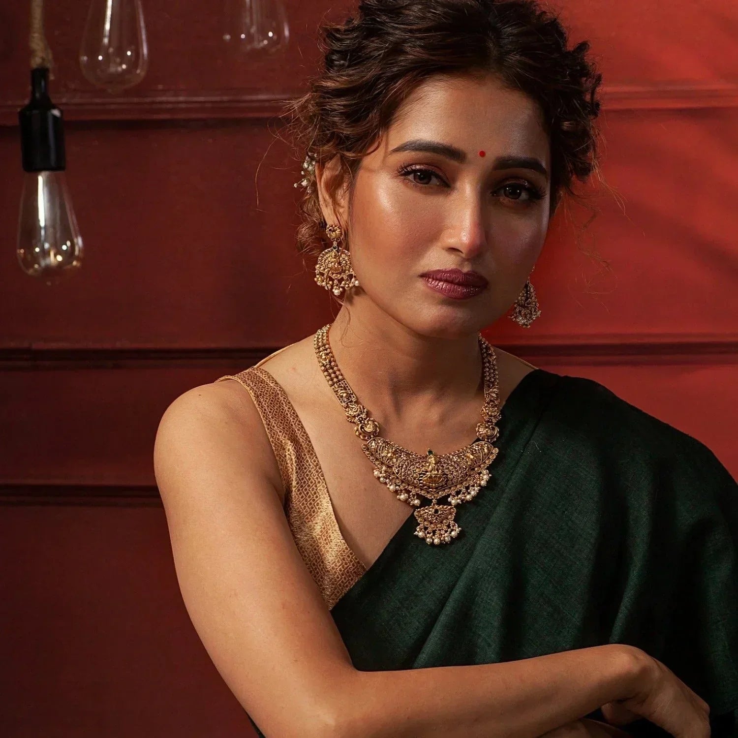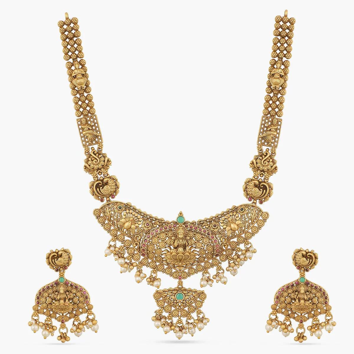 Inspired by the classic temple jewelry from the south, this antique necklace is crafted with beautiful temple elements, peacock motifs and pearls. With high quality craftsmanship and fine finish, this piece is perfect for weddings and festivals.