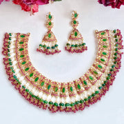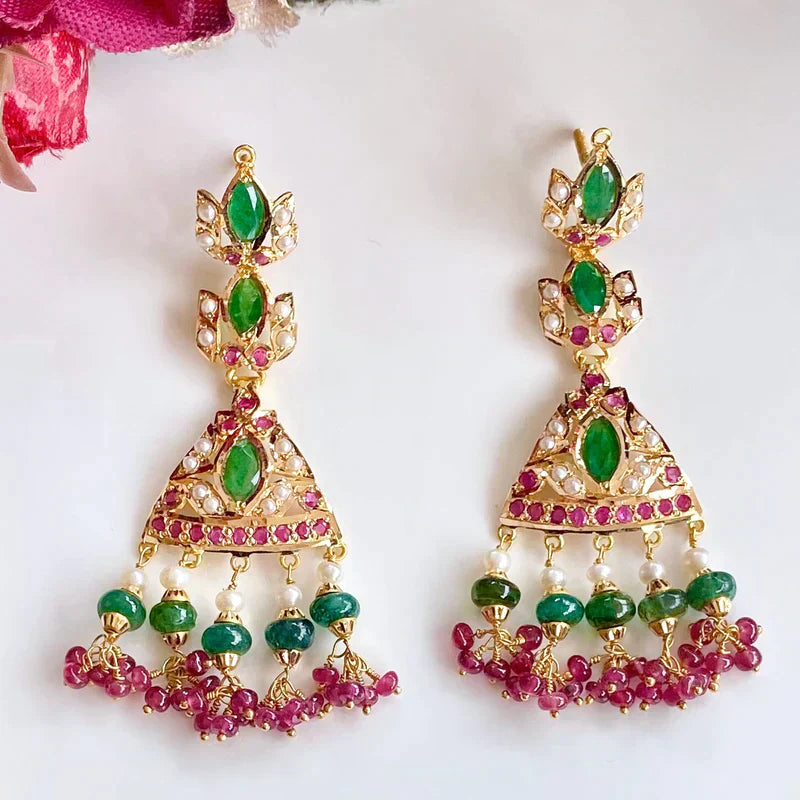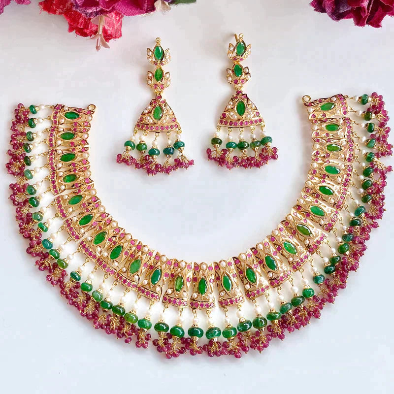 Featured is an emerald dominated necklace set. The stones in setting as well as hangings are precious rubies, emeralds and pearls.