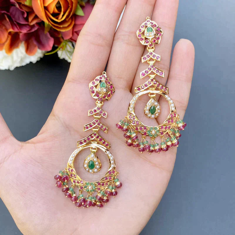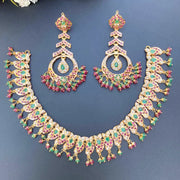 Timeless jadau necklace with matching earrings. The necklace set has been embellished with pearls, rubies and emeralds.