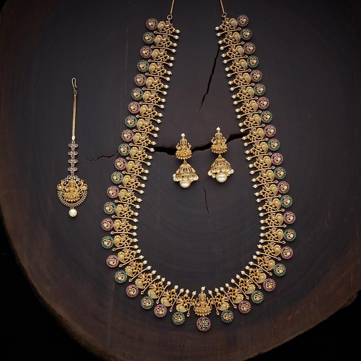 Polish Gold Base Metal Copper Alloy Stone Zircon Necklace Weight (gms) 183 Earring Weight 21 Earring Length (cms) 5 Tikka Weight (gms) 11 Earring Style Jhumka Earring Closure Type Push Back Necklace Details Adjustable Chain