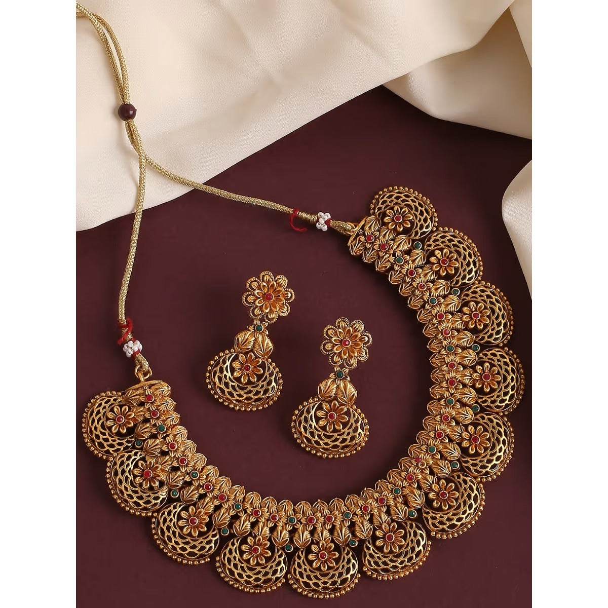 This jewellery set consists of a necklace and a pair of earrings 22K Gold-plated chocker necklace has red and green stone-studded details Secured with a drawstring closure A pair of matching drop earrings, each secured with a post-and-back closure