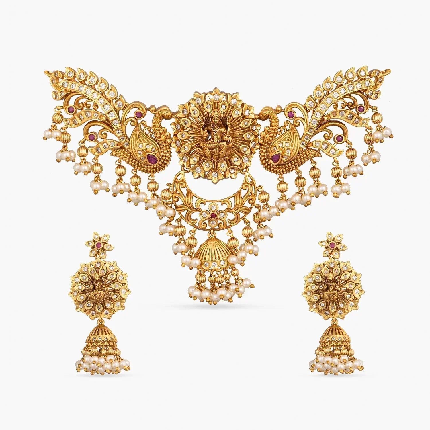 Anusri antique choker set from Tarinika represents the traditionalIndian peacock and floral motifs. Featuring a two-dancing peacock with a dangling centerpiece, this choker set is brilliantly curved on an antique gold base encrusted with CZ stones and cluster freshwater pearls. .