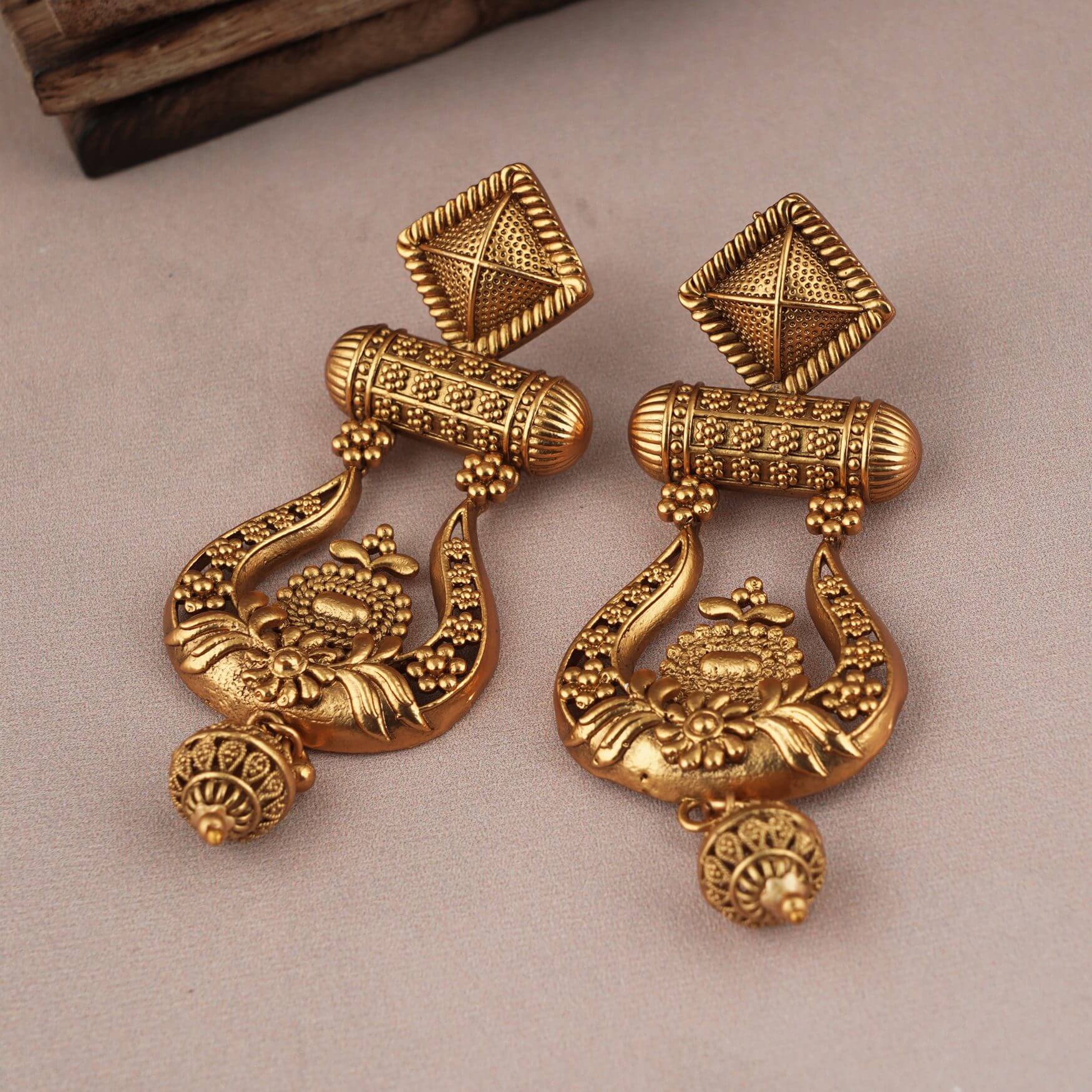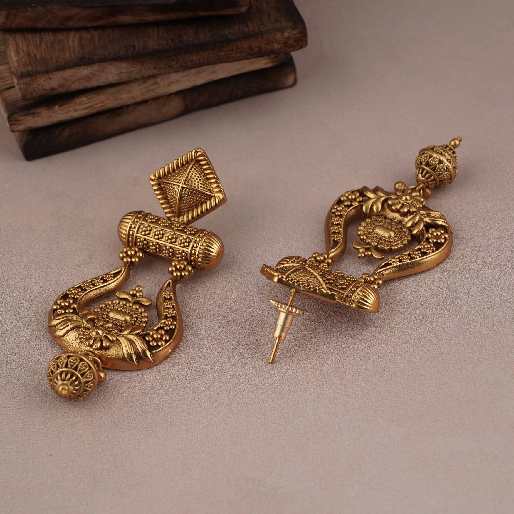ANTIQUE GOLD LONG FLORAL EARRING