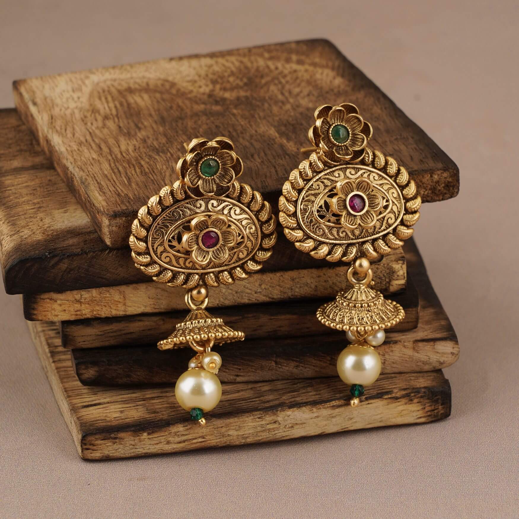 ANTIQUE GOLD PEARL DROP JHUMKA EARRING