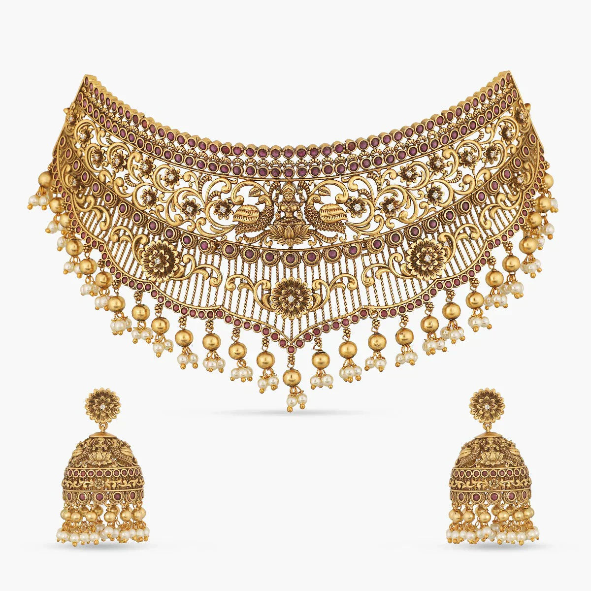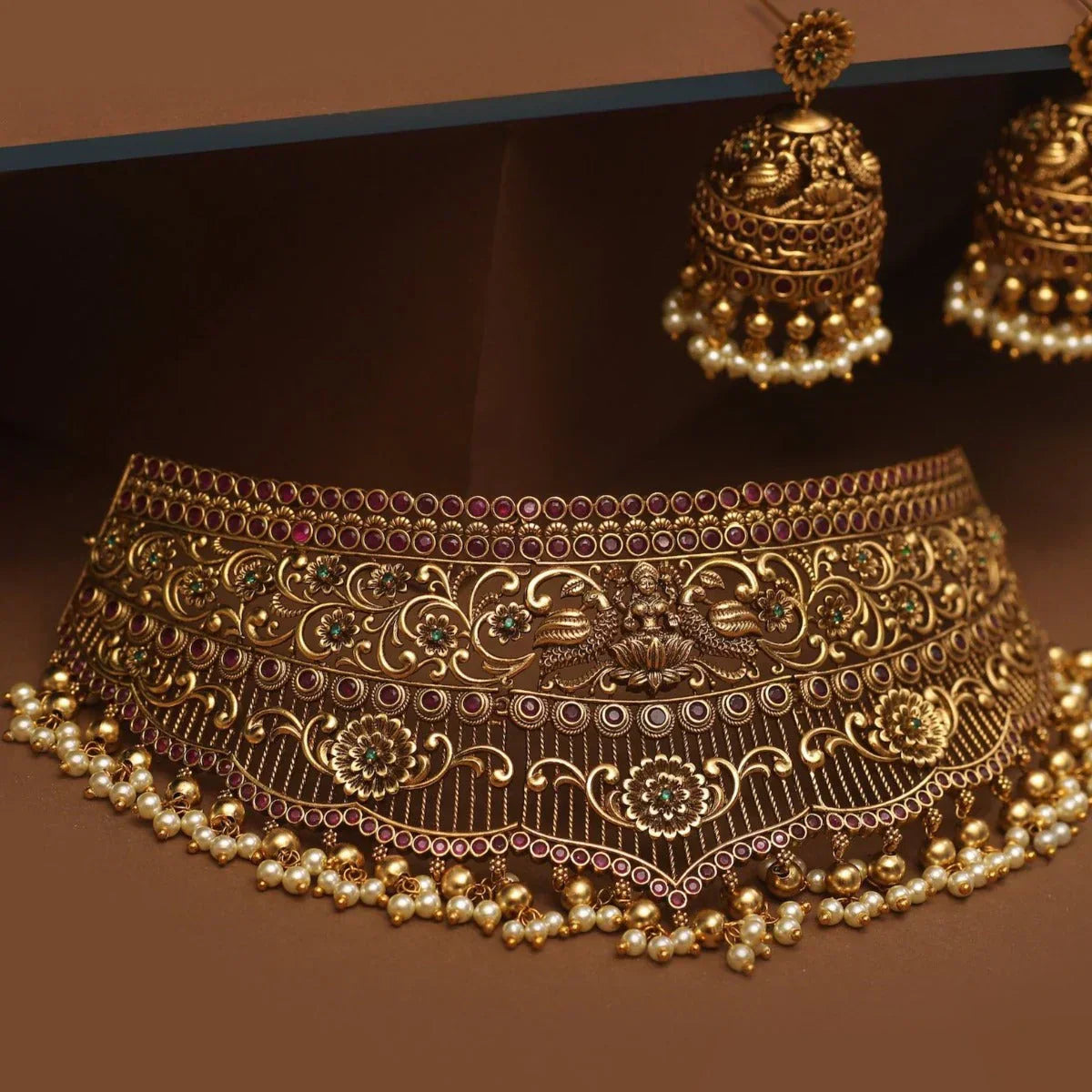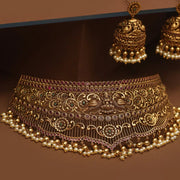Inspired by the classic temple jewelry from the south, this antique choker necklace is crafted with goddess Laxmi motifs, flower motifs and CZ stones. With high quality craftsmanship and fine finish, this piece is perfect for weddings and festivals.