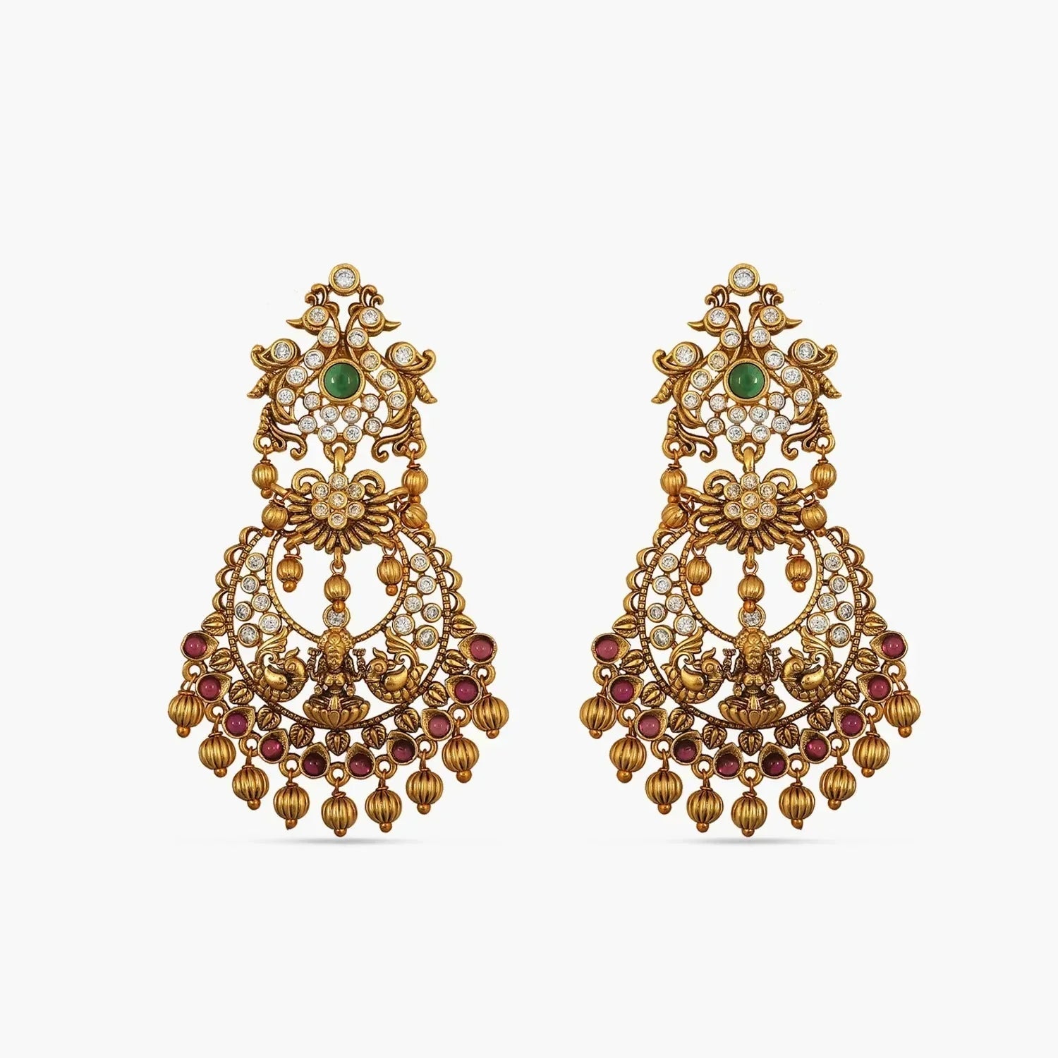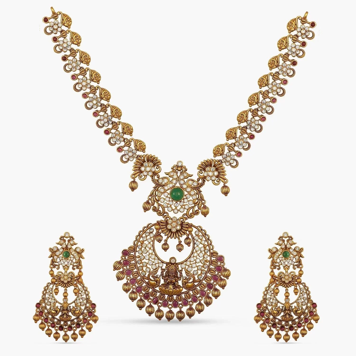 It is crafted with goddess Laxmi and peacock motifs and high-quality CZ stones. Pair with the Iditri long necklace set for a grand occasion.