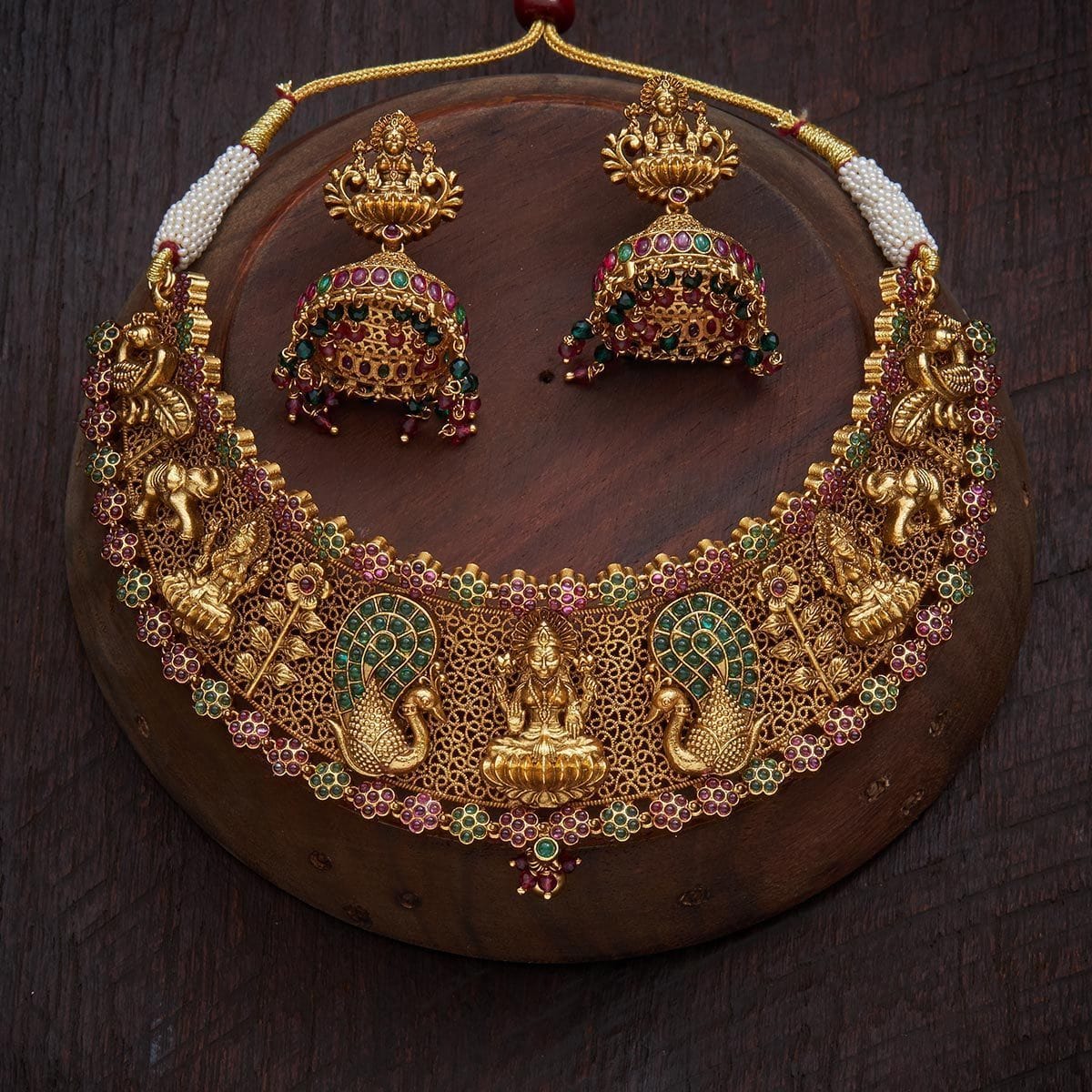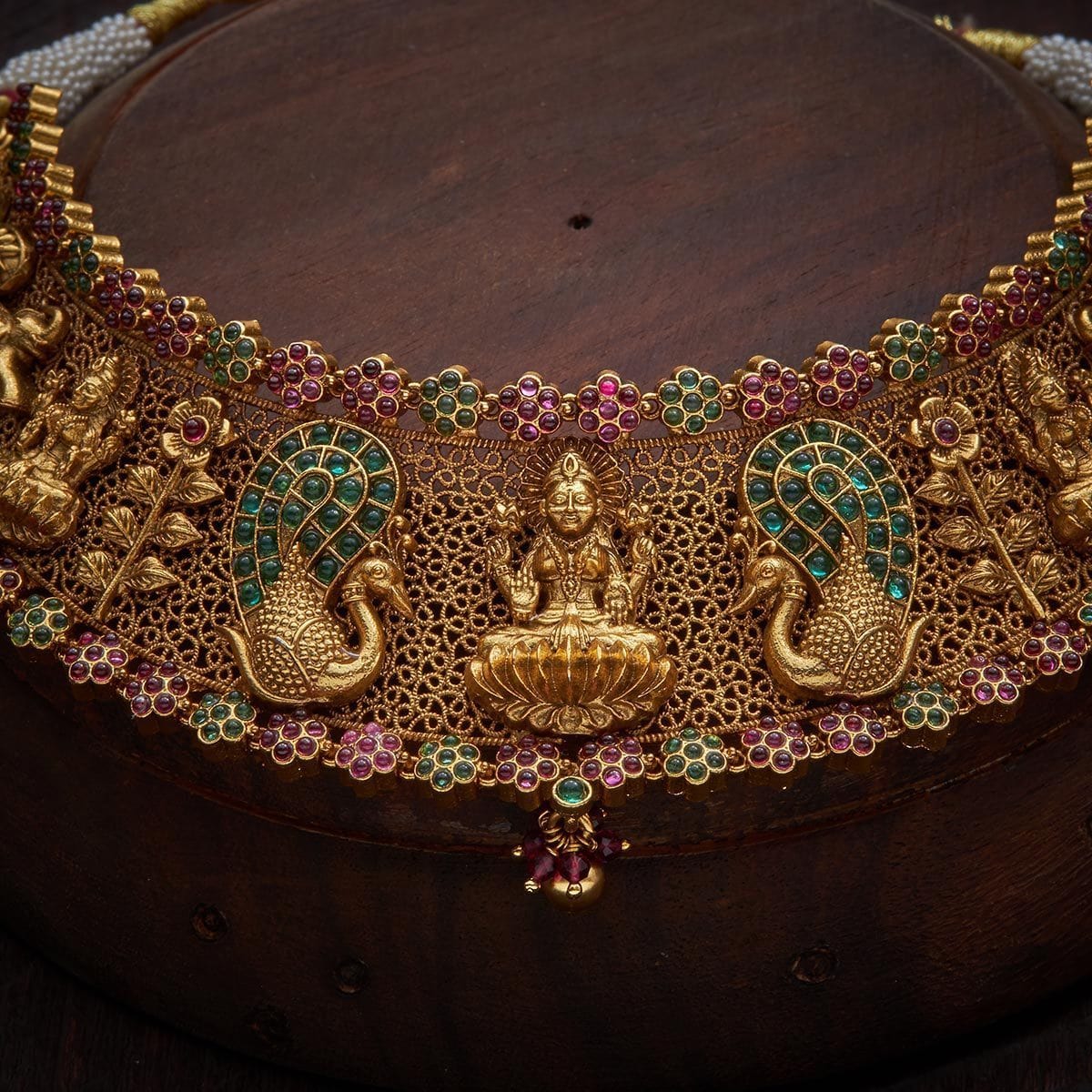 Gold-Tone Antique Bridal Necklace with Floral Detailing and Ruby-Green Jhumka Earrings Set About the Product: The radiant and remarkable antique necklace features the divine Goddess Lakshmi figurine as the centrepiece surrounded by beautiful peacocks, elephants and flowers. Floral detailing can be seen in alternating red and green colours. The jhumkas...