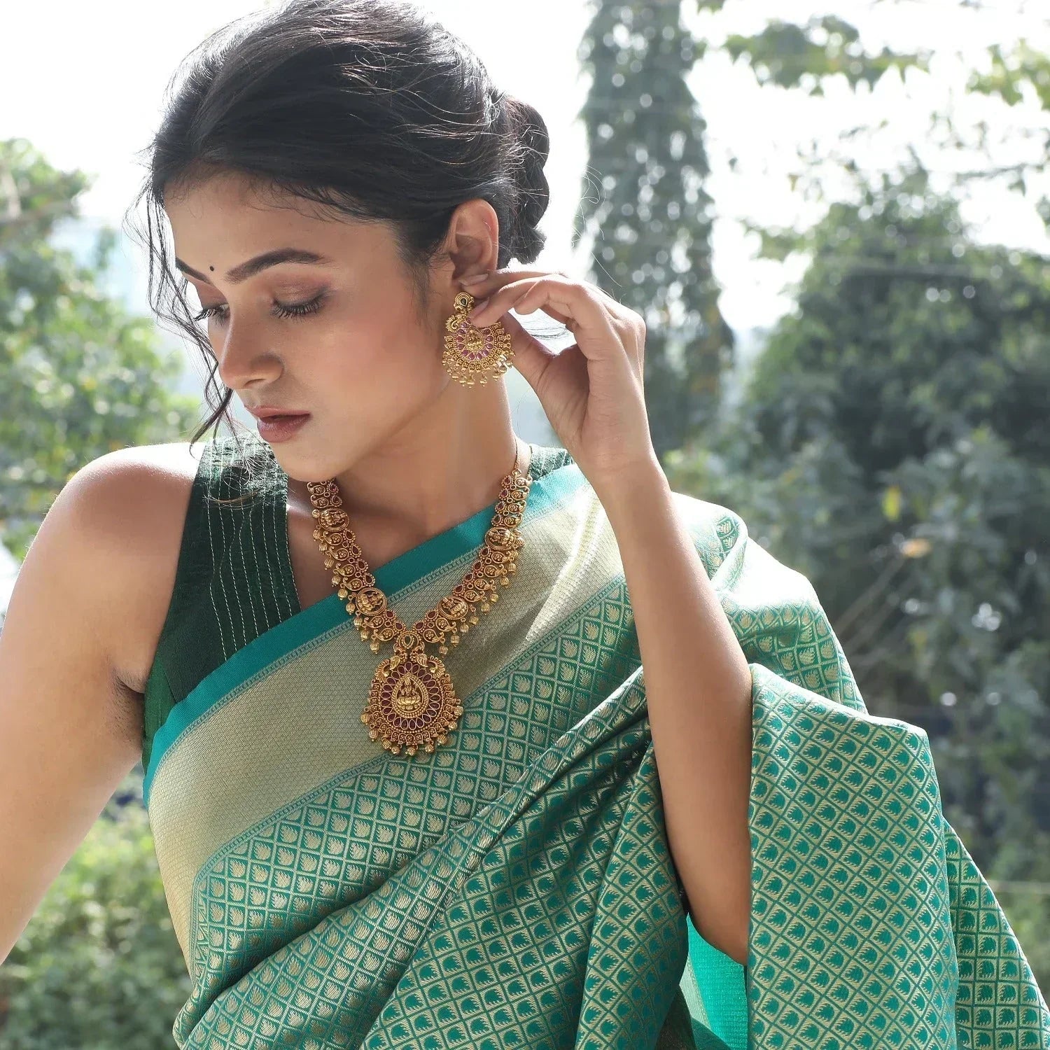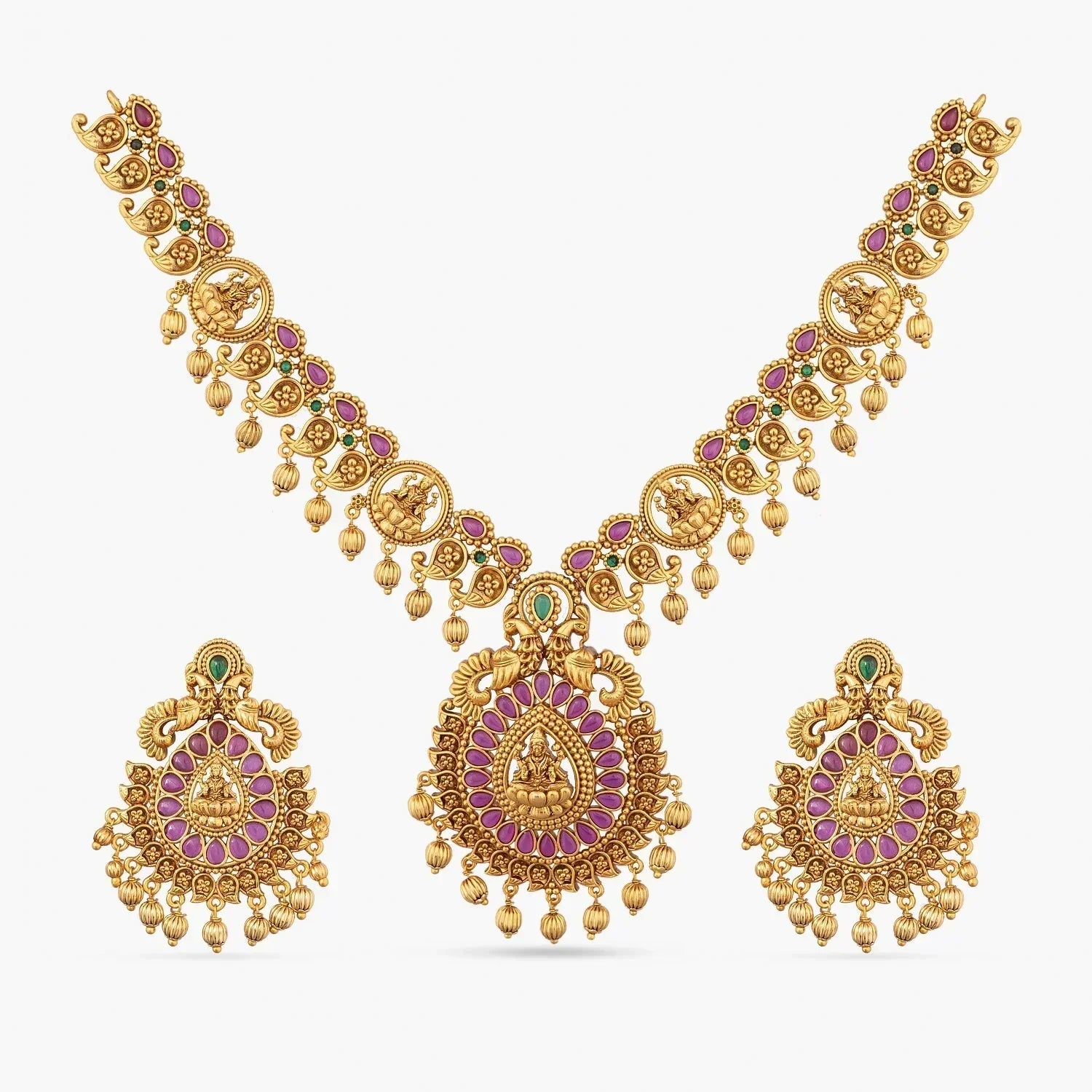 A beautiful design inspired by heritage Indian jewelry, the Adhija necklace set, is crafted with goddess Lakshmi motif, floral and bird motifs. It features high quality CZ stones and antique plated beads.