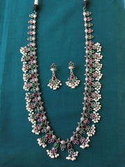 A classic real silver look alike guttapusalu haaram set made of brass base. This is a perfect contemporary jewellery set.