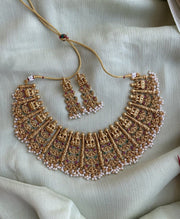 Product description: Gold Plated Guttaspusalu Pure kemp Necklace Handcrafted with Tints of White & Gold Temple Work Design Comes With a Matching Pair of Earrings and Embossed with intricacies of Ruby Stone Work.
