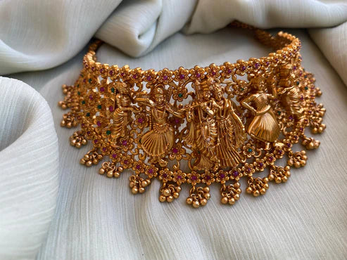 Product description : Bridal Radha Krishna Pure Uncut Heavy Choker Handcrafted with Tints of kemp Stone Work Design Comes With a Matching Pair of Earrings and Embossed with intricacies of Temple Work.