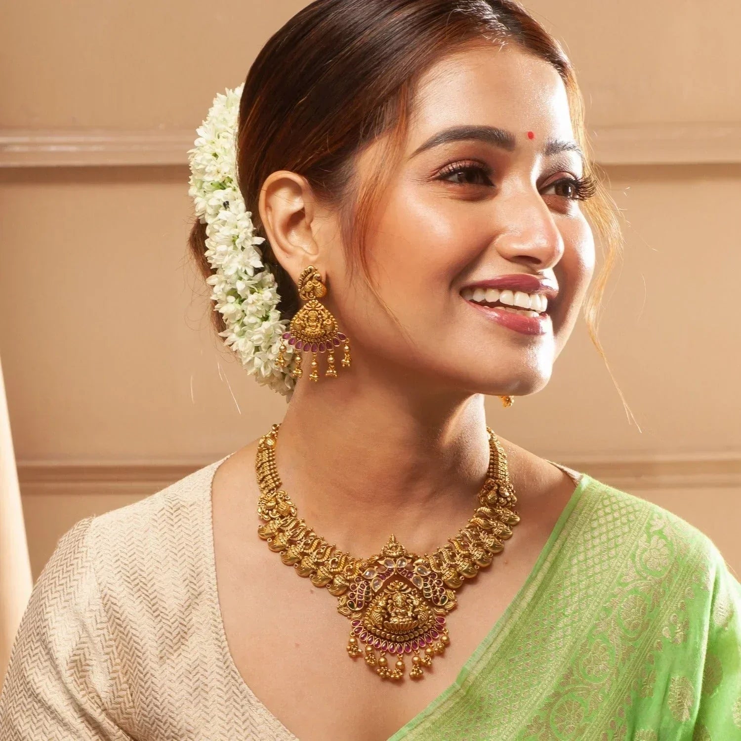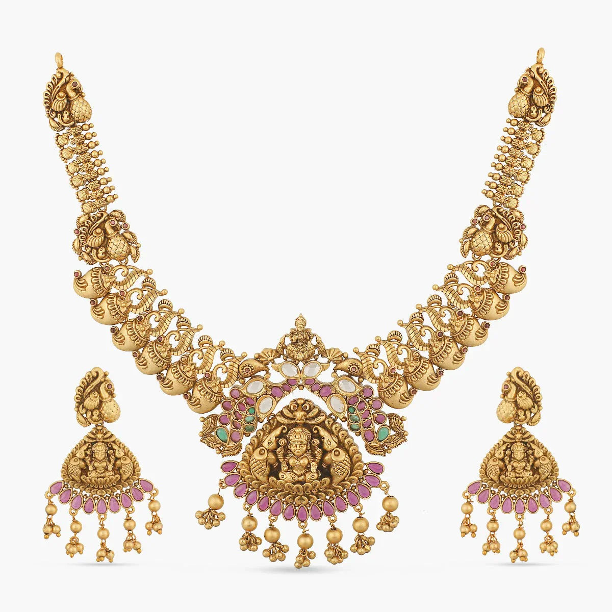 , this necklace is crafted with nakshi Laxmi motif and classic mango coins designed on a beautiful pattern chain with peacock motifs. Crafted precisely with high quality stones and antique finish.