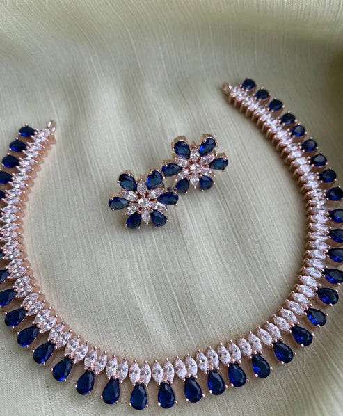 Product description : Handcrafted Rose Gold Choker with Tints of Zirconia stones and American Diamond Design Comes With a Matching Pair of Earrings and Embossed with intricacies of AD Work.